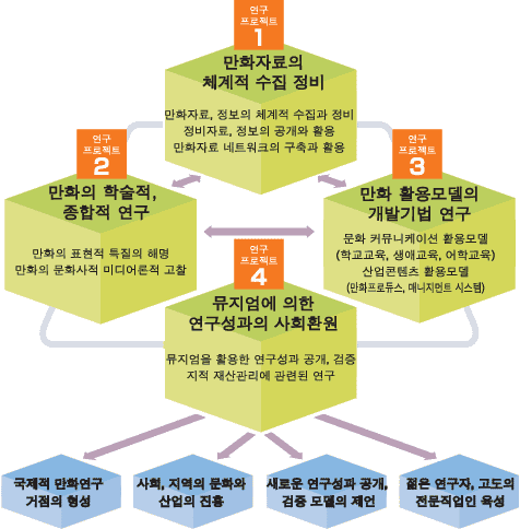 교토 세이카대학에서는 1973년도의 미술학과 만화클래스 개설, 2000년도의 예술학부 만화학과 개설, 2001년도의 표현연구기구 만화문화연구소 개설, 2006년도의 만화학부 개설의 실적이 나타내듯이, 30년 이상에 걸친 ‘만화’ 문화의 교육과 연구의 축적으로 국내외의 학문으로서의 만화연구를 리드해 왔습니다. 특히 2001년도에 개설된 표현연구기구 만화문화연구소는 만화와 애니메이션에 관한 학술적 연구를 다각적으로 실시하여 일본만화학회(현 회원수 약300명)의 설립과 운영을 적극적으로 지원하고 연구기반에 필요한 인적, 정보 네트워크의 형성을 추진해 왔습니다. 이러한 교육, 연구실적 및 네트워크는 모두 교토국제뮤지엄의 중핵을 담당할 국제만화연구센터에 활용되어 그 진전을 뒷받침하게 됩니다.