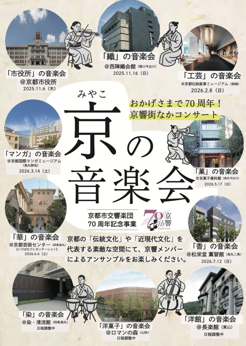 この度、京都国際マンガミュージアムでは、2026年度に創立70周年を迎える京都市交響楽団によるアンサンブルコンサートを下記の通り開催します。京都市交響楽団のメンバーが、京都ならではの「伝統文化」や「近現代文化」な空間に出向き、演奏をする「京(みやこ)の音楽会」シリーズの一環として開催されます。